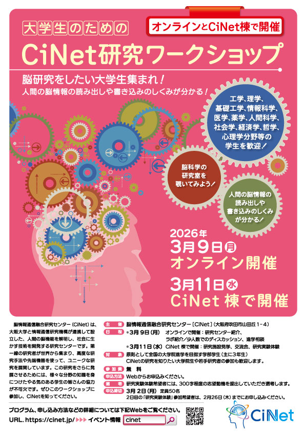 主催: 脳情報通信融合研究センター(CiNet) (大阪府吹田市山田丘1-4、大阪大学 吹田キャンパス内)